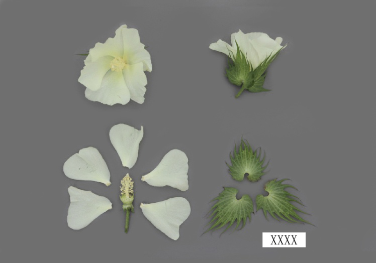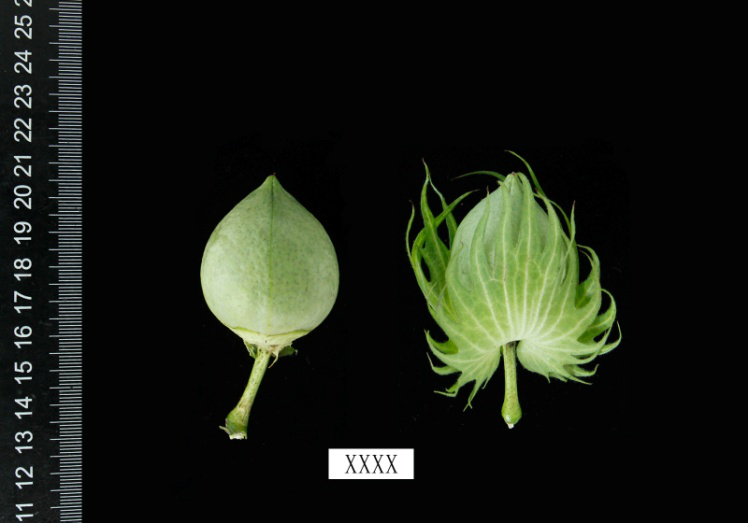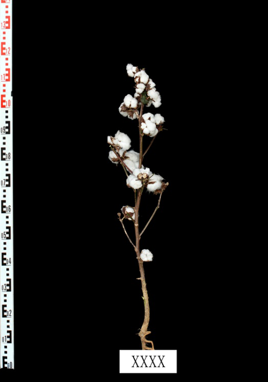 4.植株照片: 1)拍攝時期:吐絮期。 2)拍攝地點與時間:室內(nèi),上午8點至下午4點。 3)拍攝前準備:支背景支架,將背景布固定在背景支架上,下部平鋪在地面上。選擇性狀典型的棉花植株,挖出后清理根上的泥土,去除殘留葉片,然后輕靠在背景布上,左側(cè)擺放刻度尺,背面可用依靠物支撐固定。 4)拍攝背景:黑色背景。 5)拍攝技術(shù)要求: a:分辨率:1600×1120以上; b:光線:自然光及輔助光(利用5500K專業(yè)攝影燈補光); c:拍攝角度:垂直拍攝; d:拍攝模式:光圈優(yōu)先(光圈值F8,曝光補償適當(dāng)降低); e:白平衡:自定義; f:焦距:24-50mm; g:相機固定方式:三腳架。